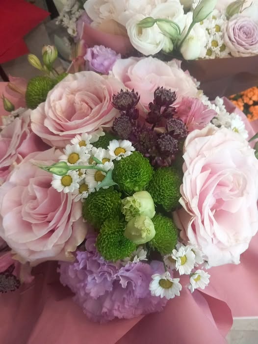 bouquet rose rosa santino verde camomilla e lisiantum